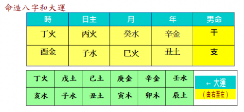 现在轮到看看周围几个字有没有木、火来帮助了,就像上面分析过一样,看不见有木来生火,只见时干一个丁火来帮助,力量单薄,而成为一个下命了。