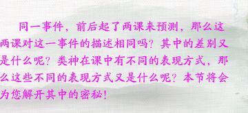 同一事件,前后起了两课来预测,那么这两课对这一事件的描述相同吗?其中的差别又是什么呢?类神在课中有不同的表现方式,那么这些不同的表现方式又是什么呢?本节将会为您解开其中的密秘!